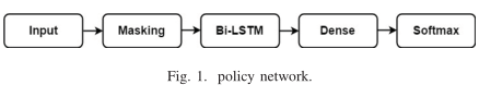 策略网络用于学习有用的策略,以确定文本中的单词是否重要。这一过程可以看作是一项序列标记任务。我们引入了 Bi-LSTM 神经网络来构建这样的策略网络,如图1所示。在该网络中,输入层用于接受经过预处理的短文本序列。输入层的最大时间步长设置为30,每个时间步长对应的词嵌入向量的维数设置为300。考虑到我们的大多数短文本都有不同的长度,我们通过 Masking Layer 来掩蔽多余的时间步长。此外,我们还采用了 Bi-LSTM,其单元数设置为64,用于提取文本的序列特征。然后引入具有64个单元的致密层来结合这些序列特征,并且每个单元通过一个 tanh 激活函数。最后,通过 Softmax layer 得到了策略网络的可能分布。动作空间的大小为2。