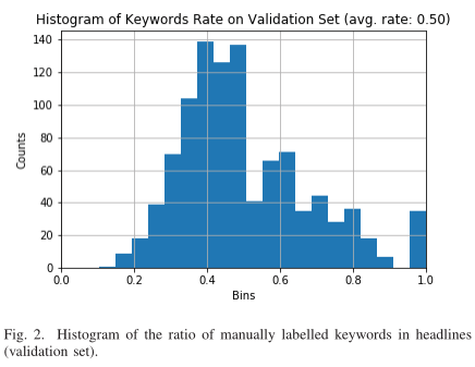 为了训练这个模型,我们爬行了大量的政府文档,并提取了每个文档的标题。爬行的文本涵盖了农业、文化、旅游、扶贫和其他政府事务的主题。爬行的标题分为训练集、验证集和测试集,分别有12925个样本、1,024个样本和2,048个样本。为了自动生成标题相关对,我们首先计算训练集中所有标题对之间的Rouge分数,其中Rouge分数被设置为Rouge-1和Rouge-2分数的平均值。对于每个标题,它都会将 Rouge 得分最高的标题配对。但是,我们不会在验证和测试集中生成标题对。为了选择超参数并量化所提出的模型的性能,我们在验证和测试集中手动选择并标注了所有标题关键词。我们首先对标题进行预处理,排除所有数字和英文部分,但仍保留停用词。然后,我们利用开源的 jieba 库对所有预处理后的标题进行标记化。通过预先训练好的词嵌入模型,将每个时间步对应的词嵌入到300维的特征向量中,作为策略网络的输入。我们计算并绘制了验证集标签标题中关键词的比例直方图,如图2所示,标题中关键词的平均比例为0.5。因此,为了使策略网络排除无关或不重要的信息,我们将等式(1)中的超参数 $\gamma$ 设置为0.5。