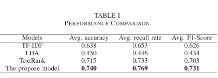 从表I可以看出,采用平均速率正则化的模型在所有评价指标上都优于TF-IDF、LDA和TextRank等传统方法。该模型的平均准确率达到0.740,平均召回率达到0.769,平均F1得分达到0.731。总的来说,该模型对于从大型无标签政府文档的标题中提取关键词是可行的,该方法为政府文档数字化领域提供了一种新的思路。